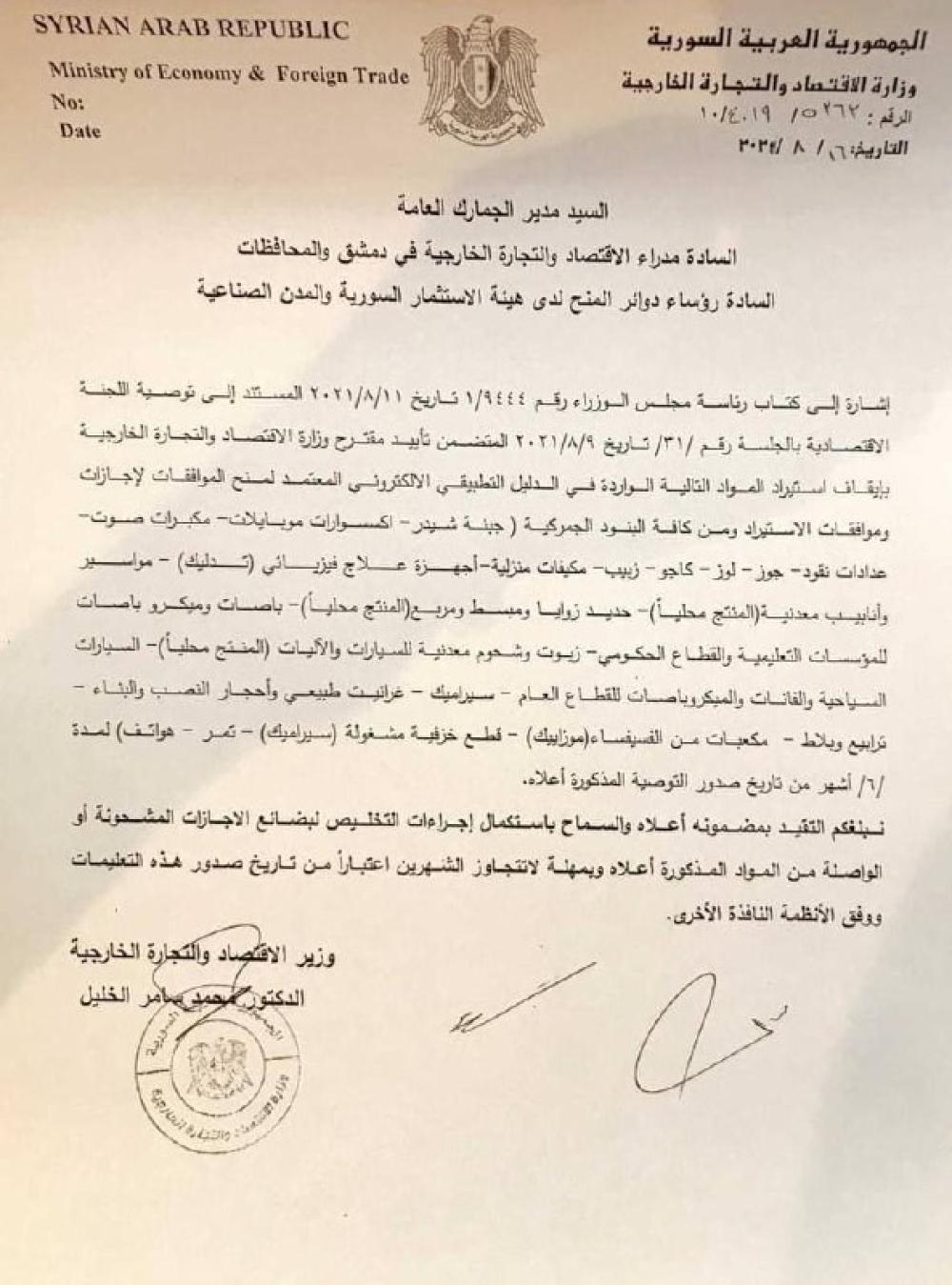 أصدر وزير الاقتصاد والتجارة الخارجية د.محمد سامر الخليل تعميماً بإيقاف استيراد بعض المواد والسلع بناءاً على المقترح المقدم من اللجنة الاقتصادية بتاريخ 9/8/2021 ولمدة ستة أشهر.