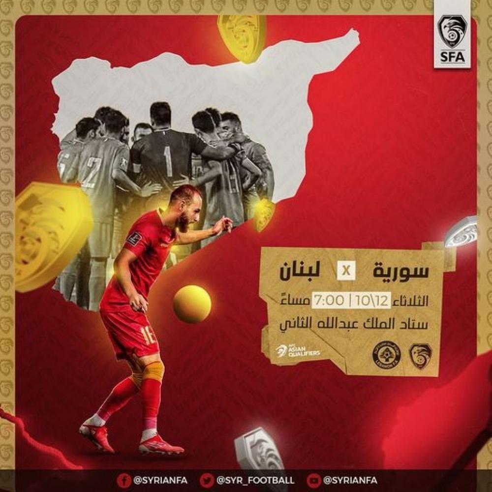 تقام مباراة سوريا ولبنان يوم الثلاثاء 12 تشرين الأول (أكتوبر) الجاري عند تمام الساعة السابعة مساءً بتوقيت دمشق والسعودية والثامنة بتوقيت الإمارات والسادسة بتوقيت القاهرة.