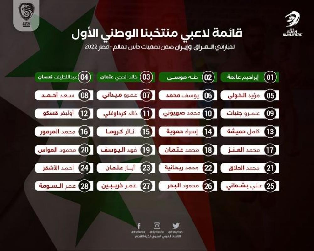 أعلن مدرب منتخب سوريا لكرة القدم نزار محروس أسماء 28 لاعباً لمواجهة منتخبي العراق وإيران الهامتين ضمن الجولة الخامسة والسادسة من التصفيات الآسيوية المؤهلة لنهائيات كأس العالم قطر 2022.